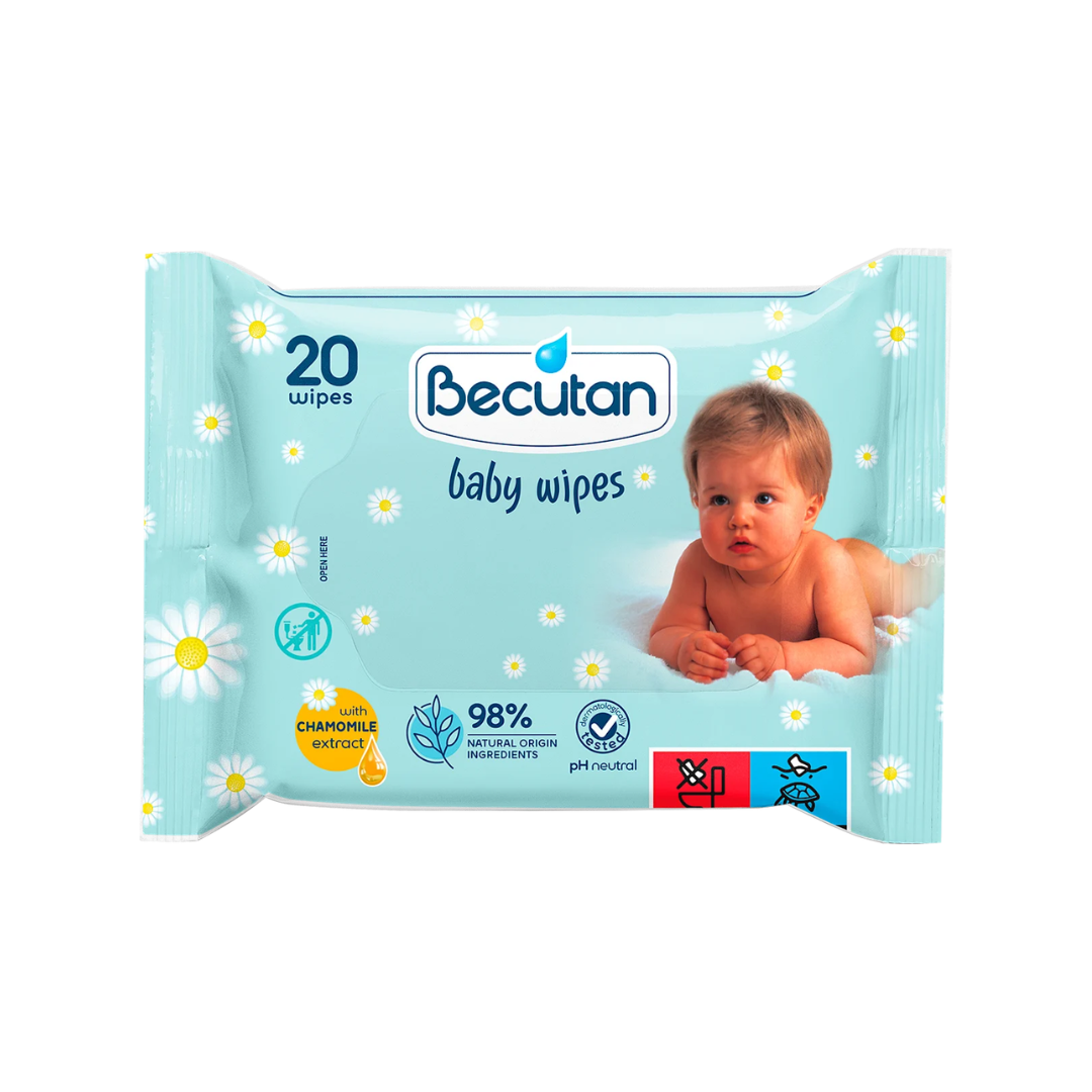 Becutan dječije vlažne maramice osiguravaju temeljno i nježno čišćenje i njegu dječije kože. Zahvaljujući hidratantnom losionu i ekstraktu kamilice, struktura maramica je mekana i štiti kožu od iritacije i umanjuje crvenilo. Nakon primjene, koža je čista i svježa. Ne sadrže alkohol i pogodne su za odrasle sa osjetljivom kožom. Proizvod je dermatološki testiran.