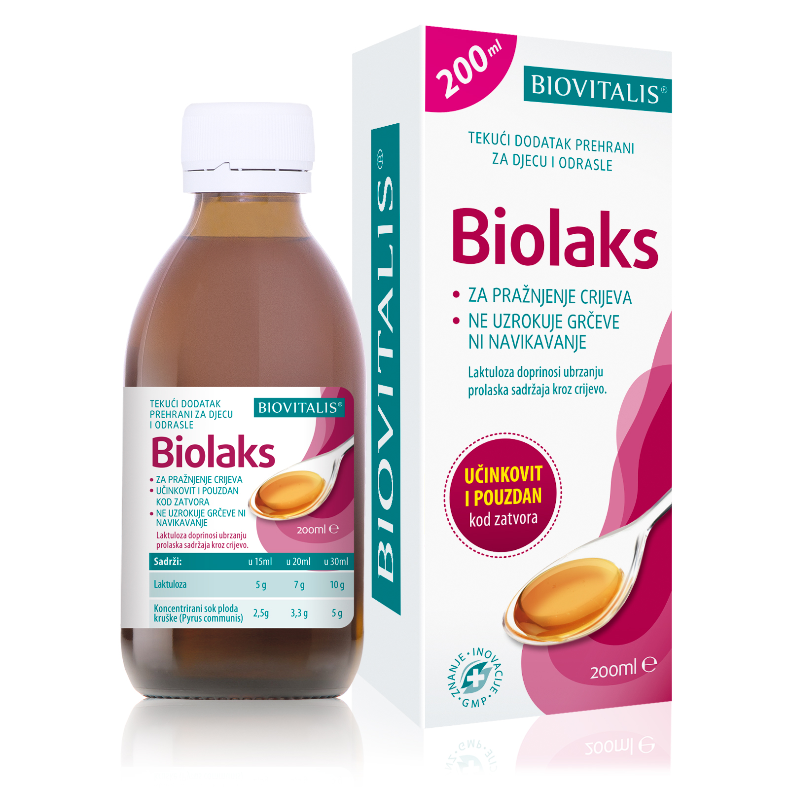 Biolaks, tekući dodatak prehrani za olakšano pražnjenje crijeva, kod opstipacije (zatvora), za djecu i odrasle