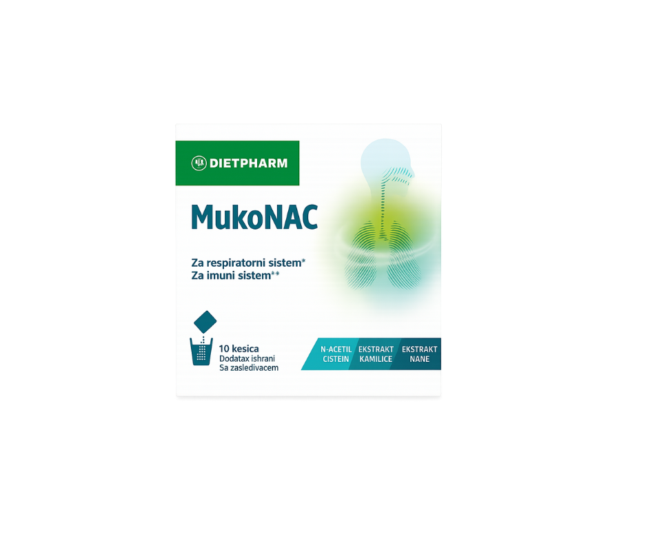 DIETPHARM MUKONAC je dodatak prehrani u obliku vrećica namijenjen za tretiranje simptoma oboljenja respiratornog sistema praćenih stvaranjem sekreta.
