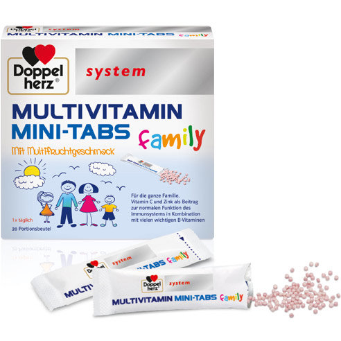 Doppelherzov sistem MULTIVITAMIN MINI-TABS opskrbljuje vitaminom C, vitaminima B: B1 (tiamin), B2 (riboflavin), B5 (niacin), B6 (piridoksin hidrohlorid), vitaminom B9 (folna kiselina), vitaminom B12 (cijanokobalamin), vitaminom B5 ( Pantotenska kiselina), kao i cink u tragovima. Za normalnu funkciju imunološkog sistema (vitamin C, cink), Za zaštitu stanica od oksidativnog stresa (vitamin C, cink), Za normalan energetski metabolizam (vitamini B1, B2, B6, B12), Za smanjenje umora i iscrpljenosti (vitamin B12, niacin, folna kiselina), Za normalne mentalne performanse (pantotenska kiselina). Ovim dodatkom prehrani djeca i odrasli koji imaju problema s uzimanjem tableta ili kapsula mogu podržati opskrbu hranjivim sastojcima. Zahvaljujući posebnoj proizvodnoj tehnologiji, porodica Doppelherz MULTIVITAMIN MINI-TABS sadrži svoje hranljive sastojke u obliku inovativnih MINI-TAB-ova s ukusnim ukusom više voća. Mali MINI-TABSI mogu se uzimati bilo kad i bilo gdje bez tečnosti – idealno za putovanje. Ovaj oblik doziranja pogodan je za djecu, adolescente i odrasle, tj. Za cijelu porodicu. Dvostruki sistem srca MULTIVITAMIN MINI-TABS porodica cijelu porodicu pruža vrijednim hranjivim sastojcima i doprinosi zdravlju i dobrobiti.