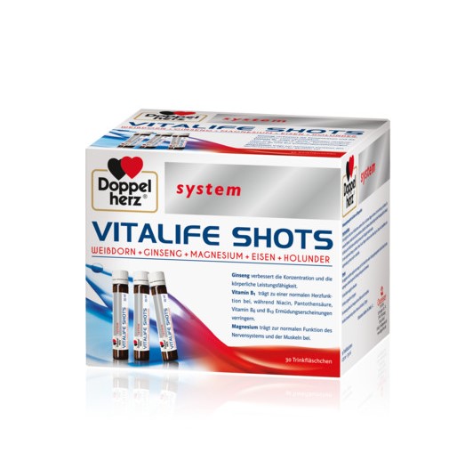 Doppelherz VITALIFE SHOTS sistem sadrži sastav pažljivo odabranih sastojaka koji doprinose: vitalnosti (ginseng), imunitetu tijela (selen, cink , gvožđe), pravilnom radu mišića (magnezijum), radu srca (tiamin). Pored toga, preparat je obogaćen koncentratom crvenog vina i ekstraktom sjemenki grožđa. To je proizvod namjenjen za ljude koji vode intenzivan način života, fizički su aktivni i žele održati zdravlje i dobro stanje tijela.