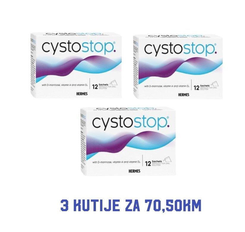 CYSTOSTOP granule za oralnu upotrebu su dodatak prehrani sa D-manozom vitaminom A i vitaminom D3, koji pomaže u kontrolisanju bakterijskih infekcija mokračnog mjehura. Granule za oralnu upotrebu s aromomn brekve,ekstrakta lista breze koji sadrži D-manozu.