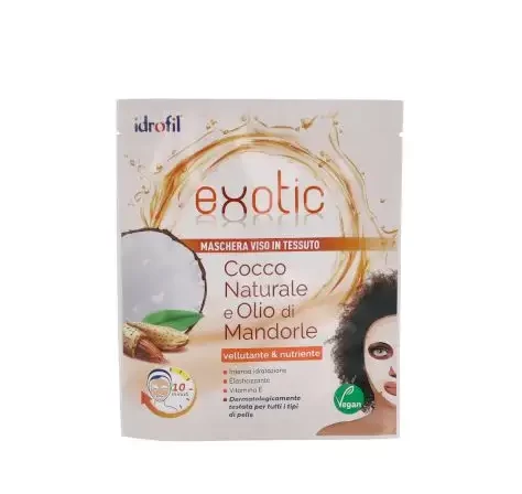 Idrofil egzotična maska za lice od tkanine, sa prirodnim kokosovim i bademovim uljem, daje baršunasti i njegujući efekat. 100% viskoza, biorazgradiv, kompostabilan.