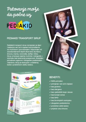 PEDIAKID® sirup protiv mučnine i povraćanja kombinuje prirodne aktivne sastojke za koje je poznato da ublažavaju mučninu ili kratkotrajno povraćanje. Sadrži g ingbir za koji je poznato da smiruje simptome mučnine, dok čičak, žalfija i menta poboljšavaju probavu. Stoga se ovaj proizvod preporučuje kod simptoma mučnine ili povraćanja i više nego preporučljivo ako ste na dugoj vožnji ili putovanju (čamac, avion…).
